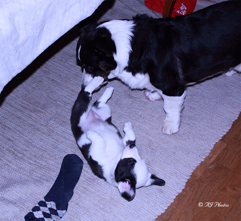 Nu var det min tur. Jag nosade av dem en efter en noga, det var två killar och en tjej. Sedan ville jag leka lite och bjöd en av valparna till bus. Han hängde med så vi lekte bra länge och hade skoj. Jodå jag var jätteförsiktig med dem, men valpen bet rätt hårt ibland och då gick jag bara åt sidan en stund, sedan lekte vi igen. Matte var imponerad, och det var Aylens matte också. Men vadå jag tyckte valparna var helsöta och jättekul att leka med. De låter jättekaxiga, men vågar inte riktigt helt fullt ut att skälla eller morra, men de försöker.